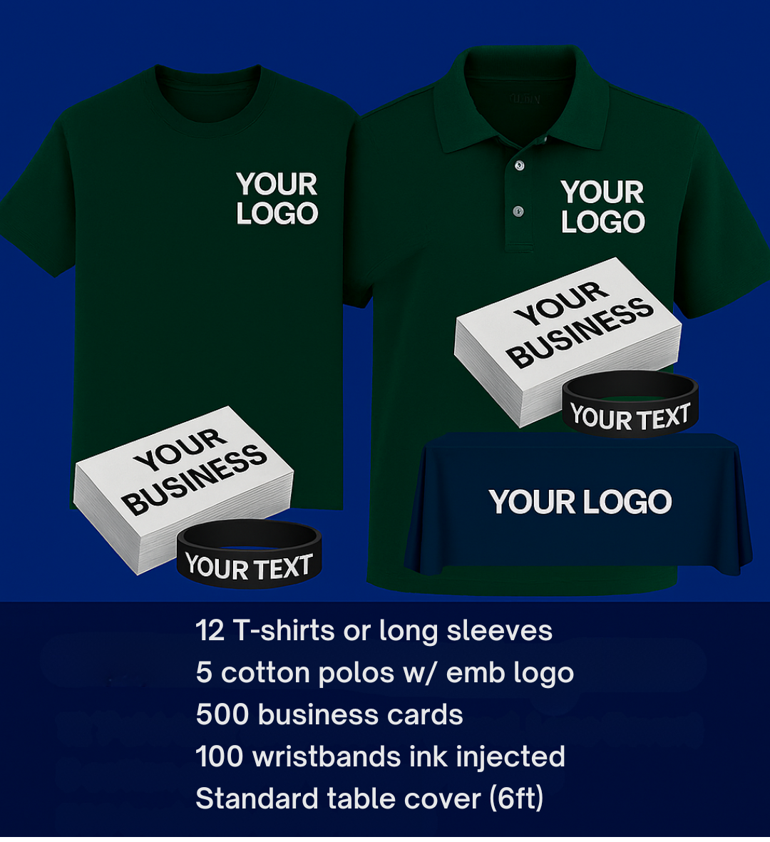 A compact, cost-conscious branding kit designed to outfit a small team and support trade-show or outreach needs with coordinated apparel and essential marketing items.
